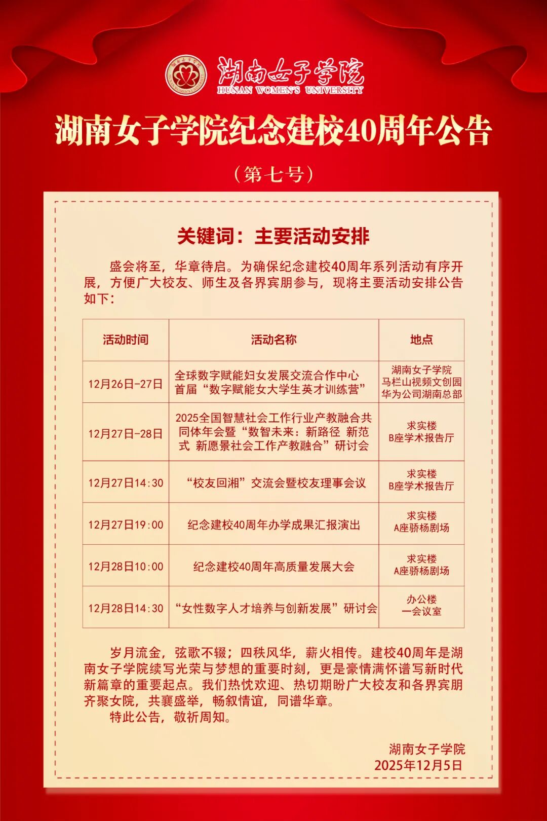 湖南女子学院纪念建校40周年公告(第七号)